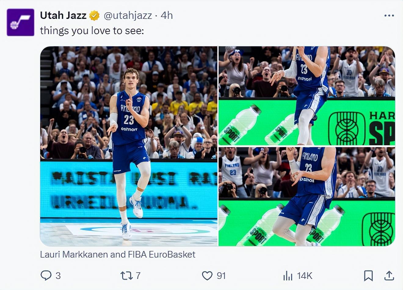 欧洲杯期间爵士队官方也终于获得了流量密码,几乎每一条推文都跟马尔卡宁有关,马卡在欧洲杯的表现实在是过于炸裂,全世界的球迷都被马卡FIBA大杀器的表现折服。