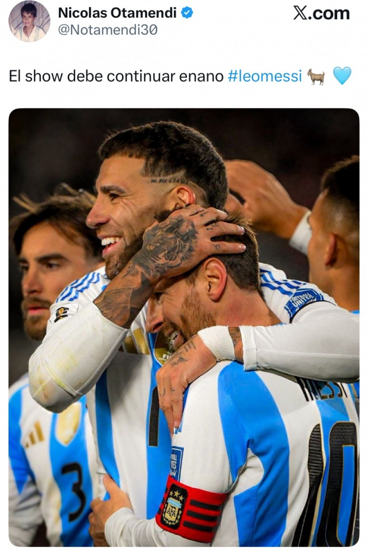 赛后奥塔门迪更新社媒,晒出了自己和梅西相拥庆祝的照片,并配文写道:“让你精彩纷呈的演出继续吧,GOAT。”