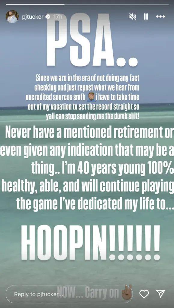 大概一个月前,尼克斯东决出局后不久,有流言称,PJ塔克正在考虑退役,然后塔克本人亲自辟谣,他在社媒上写道:我从未说过退役,甚至从未暗示过这件事,我今年40岁,还在当打之年,100%健康且有能力,我会继续打这项我奉献了一生的运动。